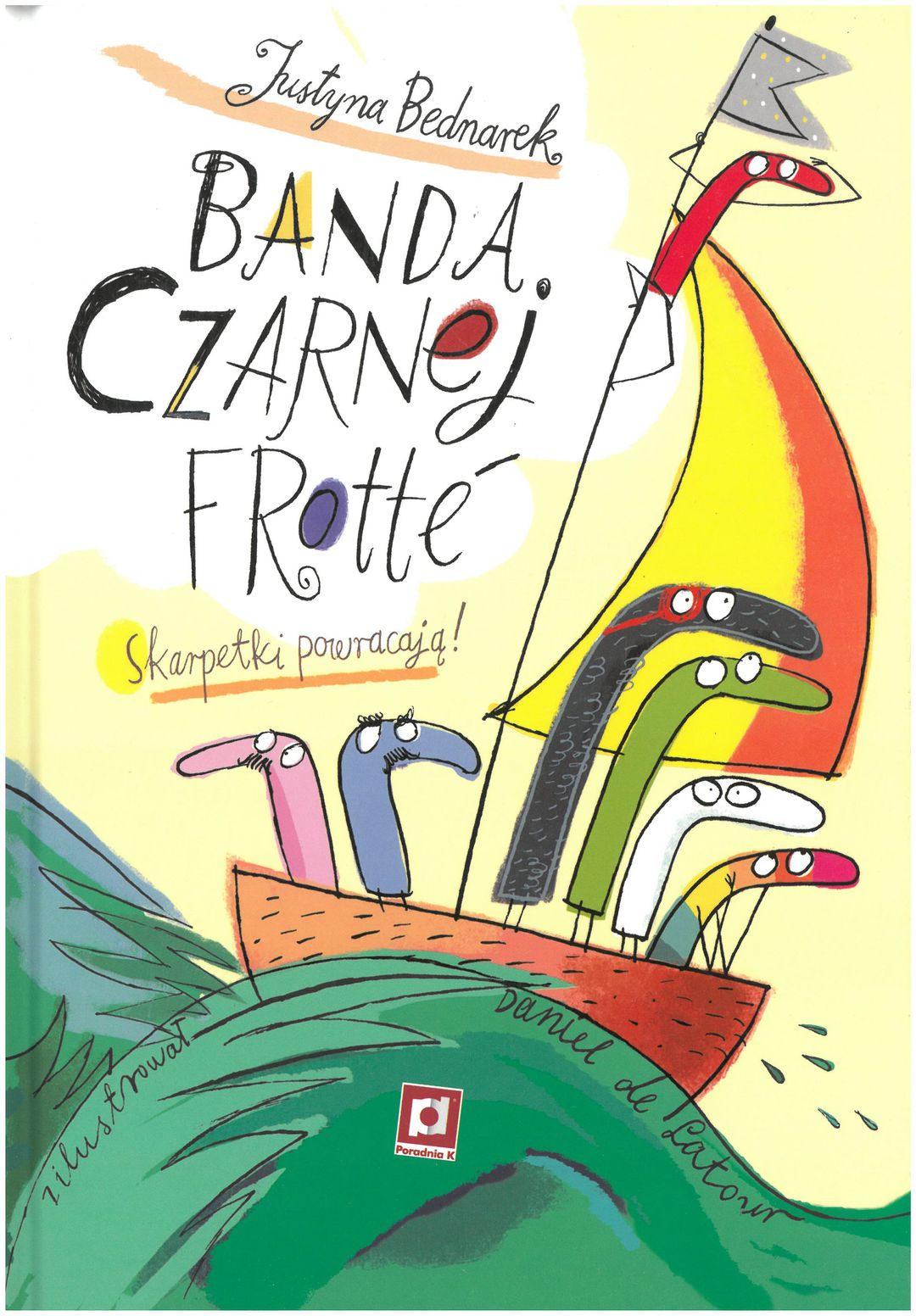 Skarpetki powracają! „Banda czarnej frotte” w natarciu. Modlitwy fanów w każdym wieku zostały wysłuchane! Justyna Bednarek napisała kontynuację historii uwielbianych Skarpetek, a Daniel de Latour po raz trzeci tchnął w nie życie. Jak zawsze, na początku historii naszych bohaterek są zew wolności i marzenia. Tym razem czarna skarpetka frotté ucieka przez znaną nam dziurę pod pralką, ponieważ obawia się, że może wylądować w śmieciach. Dostaje się na okręt, gdzie poznaje sympatycznego pająka. Pomaga jej on zdobyć niewielką szalupę, którą nasza bohaterka zamierza opłynąć świat. Zaczyna prowadzić dziennik jak prawdziwy wilk morski. Z rozdziału na rozdział poznaje nowych członków załogi i tak rozpoczyna się historia gangu. Wkrótce w ślad za bandą wyrusza tajemnicza postać… Każdy rozdział to osobna przygoda, pełna nieoczekiwanych zwrotów akcji i niespodzianek. Podążamy tropem bohaterów i sami marzymy o tym, by dołączyć do bandy. Kto wie, może uda się nam dostać na statek i ruszyć w podróż dookoła świata? Nasz okręt wypływa już 3 kwietnia. Skarpetki znają i kochają już nie tylko polskie dzieci - pierwsza książka Justyny Bednarek została przetłumaczona na ukraiński, czeski, hiszpański, włoski, rosyjski i grecki. W Polsce tytuł ten zdobył wiele nagród i wyróżnień, a także został lekturą szkolną. Czy i trzecia część stanie się bestsellerem? Przekonamy się już wkrótce. [www.empik.com]