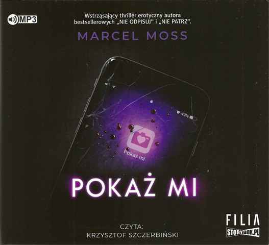 lecz z czasem zaczyna angażować się w internetową znajomość. Wykonuje polecenia Królowej, zwierza się jej, chce się do niej zbliżyć. Niestety okazuje się, że niewinny flirt ma drugie dno… Pokaż mi Marcela Mossa to thriller, w którym głównym bohaterem i narratorem jednocześnie jest Łukasz. To młody mężczyzna, który ma kochającą partnerkę i niezłe zarobki, jednak z czasem to wszystko zaczyna go nudzić i przytłaczać. Postanawia, za namową kolegi, wdać się w niezobowiązujący flirt w aplikacji randkowej. Łukasz jest dość ostrożny, stara się nie ujawniać szczegółów, które pozwoliłyby go rozpoznać komukolwiek. Jednak im bardziej angażuje się w internetową relację, tym bardziej zaniedbuje to, co ma obok siebie na co dzień. Łukasza czasem nie za bardzo da się lubić. Nie grzeszy wiernością, kłamie, imprezuje, zostawiając swoją narzeczoną samą, nie dba o nią. Nie do końca wie, czego chce od życia i ciągle szuka wrażeń.